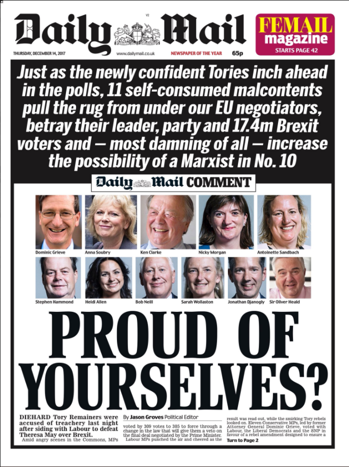 According to the newspaper, the Tory rebels, which also included Anna Soubry, and Nicky Morgan, have betrayed “their leader, party and 17.4 million Brexit voters”.